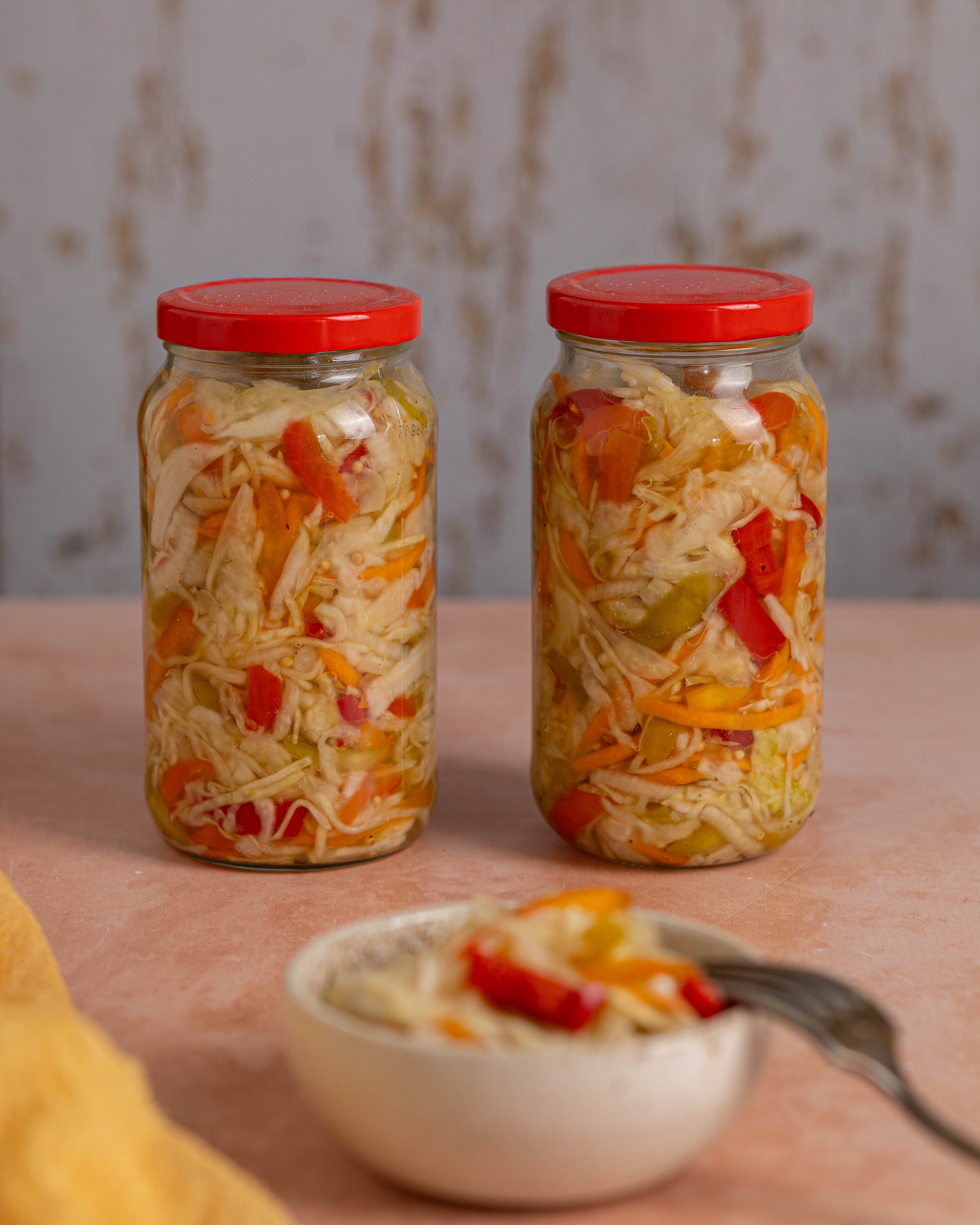 V kastrolu svaříme ocet, cukr, sůl a koření. Minutu necháme probublat a odstavíme z ohně. Necháme zchladnout a nalijeme na zeleninu. Dobře promícháme, zakryjeme a necháme odpočinout do druhého dne. Zelenina pustí ještě vodu a zkřehne.